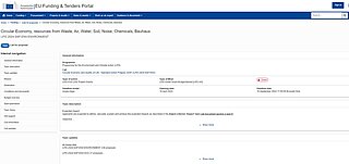 Wenn Sie sich für ein geeignetes Topic im Portal entschieden und dieses angeklickt haben, öffnet sich eine neue Seite mit verschiedenen Menüs im linken Seitenbereich. Über diese Menüs gelangen Sie zu allen für Sie relevanten Informationen und Dokumenten des Förderaufrufs.